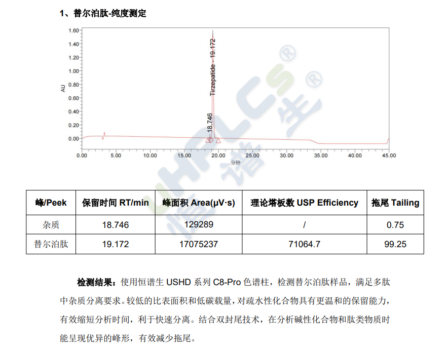 恒谱生USHD系列C8-pro色谱柱双封尾工艺,稳定性强,检测酸性、碱性化合物时具有良好的峰型,较低的比表面积,略大的孔径,抗污染性增强具有比普通C8柱明显更长的柱寿命,性能较佳。