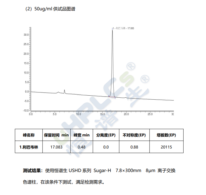 该色谱柱可在 pH 1.0–3.0 的强酸环境及 ≤95℃高温条件下长期稳定运行,适用于柠檬酸、苹果酸、琥珀酸、甲酸等多种有机酸的定性与定量分析,同时严格满足《中国药典》及相关行业标准中对利巴韦林杂质分离的要求。